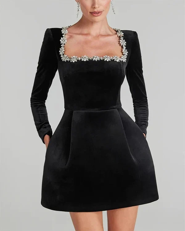 Stap in een wereld van pure elegantie met de Yara-jurk, een perfecte combinatie van luxe en verfijning. Gemaakt van hoogwaardig fluweel en afgewerkt met sprankelende strassdetails, is deze jurk dé keuze voor gelegenheden waar u een blijvende indruk wilt achterlaten. Het A-lijn silhouet en de zorgvuldige afwerking zorgen voor een stijlvolle en tijdloze uitstraling.
